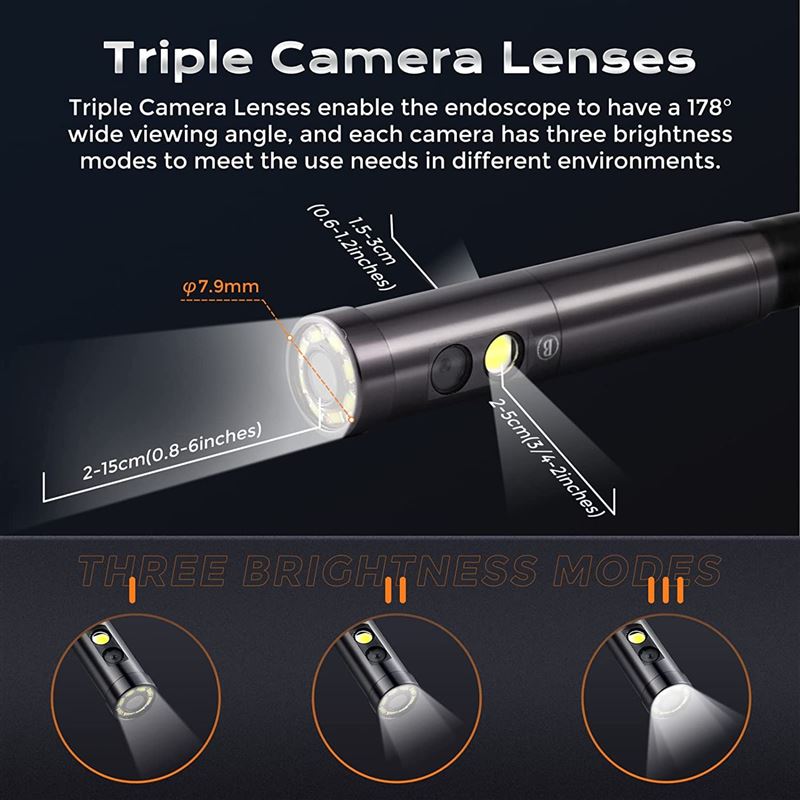 The DT-M50-T Triple Lens Inspection Camera is a professional-grade visual inspection tool designed for precision, clarity and ease of use. Featuring a large 5 inch colour screen and a powerful triple camera system, this inspection camera allows you to view hard-to-reach areas with exceptional detail. With a front-facing camera and two side cameras, users gain a wider field of view, reducing blind spots and improving inspection efficiency.