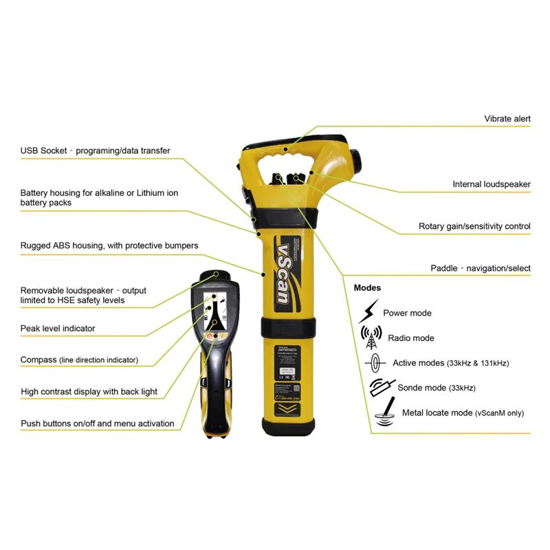 The Vivax-Metrotech vScan Receiver is a tough, user-friendly utility avoidance tool designed to help you locate buried services quickly and safely. With its intuitive controls, large back-lit display, and clear audible, visual, and vibration alerts, the vScan receiver provides dependable performance in even the most demanding site conditions.